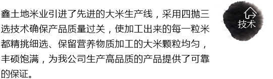 鐵等礦物質,無污染的環(huán)境,豐產的水稻資源,使鑫土地米業(yè)不斷發(fā)展壯大,成為綏化地區新崛起的一支精制大米生產的生力軍。